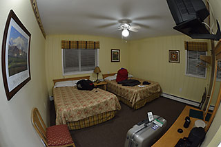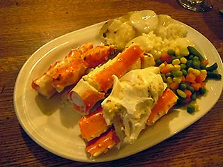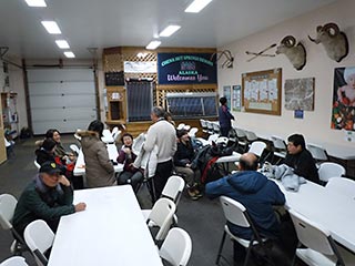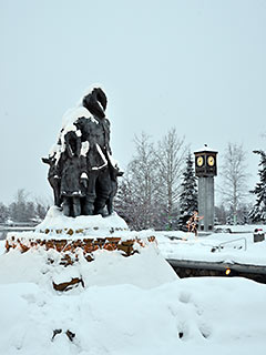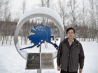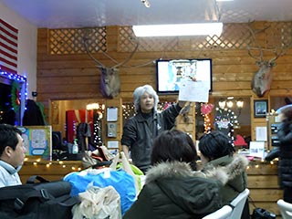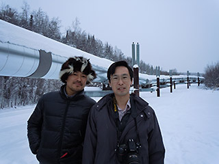 ちょっと寄り道です。 北極海で産出された石油をアラスカ半島の北から南へ縦断して油送する延々1300kmも続くアラスカパイプラインです。 パイプラインはパイプの伸縮に対応できるようにくねくねと曲がりながら、そして、台座には乗せてあるだけだそうです。そして、永久凍土を溶かしてしまわないように、台座には放熱用の大きなフィンが付いています。 ![]() 直径1.5m位の丸いものが、パイプラインの石油の通る部分の直径を表しています。 その円の中にあるアラスカ州東部に北から南に線に見えているのがパイプラインの通っている場所です。 ![]() このあと、ダウンタウンにあるGolden Heart Plazaという、「知られざる最初の家族」の像のある公園に立ち寄りました。 公園内は雪が結構積もっていて、普通の靴を履いていたので、思うように移動できませんでした。 その後、一旦ホテルに戻り、現地ガイドのイトウさんと一旦お別れしました。 そして、先に書いた忘れ物の件ですが、ありました! 良かったですね〜。ちゃんと指に填めてないとダメですよ! ![]() このあと、バスは真っ直ぐに今夜の目的地のチェナに向かいました。その距離、ざっと100km。 夕方16時少し前に到着。もうすっかり暗くなっていました。 ここは温泉、宿泊施設、オーロラ観望、その他いろいろなアクティビティが楽しめる、陸の孤島です。 電話も衛星回線のみという環境で、当然、ネット環境などありません。自然を満喫するための隔てられた素敵な場所です。 まずは、ここの施設の説明を受けました。温泉は宿泊客は無料です。 ![]() 説明を受けていたアクティビティーセンター内の様子。 ここはオーロラ観望できる滑走路に面した建物で、オーロラが出ていない時に待機する場所です。滑走路への出口付近はガラス張りの小部屋があり、そこからオーロラを眺めることもできます。 ![]() 一通り説明を受け、部屋の鍵を受け取り、夕食までの短い時間、自由行動です。 部屋は、アクティビティーセンターのすぐ隣の8部屋ある2階建ての建物103の2階でした。 ![]() 部屋の中の様子。暖房控えめでちょっと寒かったです。 食事前に温泉にささっと行くことにしました。 ![]() 温泉までも数十メートルの近さ。屋内にはジャグジーやプールがあります。水着に着替えて、まずはジャグジーで体を温めます。そして、お楽しみの露天風呂へGo。ハダカで数十メートル歩き、緩いスロープを下りながら温泉に入っていきます。照明が落とされているので様子がよく分かりません。 まるでプールのように大きな源泉掛け流しの露天風呂でした。深い風呂で立って入るタイプです。足元の砂利が気持ちいいです。 雪がチラチラ舞う暗闇の中、奥の方に歩いて行くと、先に入っていた高坂先生が。赤い照明を使ってお遊び写真を撮ってもらいました(画像提供、高坂氏)。 もっとゆっくりしていたかったのですが、夕食までにヒートダウンしておかないと汗だくになりそうだったので、後ろ髪を引かれつつも風呂を上がりました。 部屋に戻ったとき、髪の濡れていたところが凍っていました。 ![]() さて、お待ちかねの夕食です。雪の中を少し歩き、リゾート内のレストランへ。 レストランの入り口です→。 本日のメインディッシュは、、、、、、