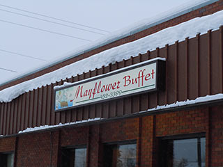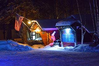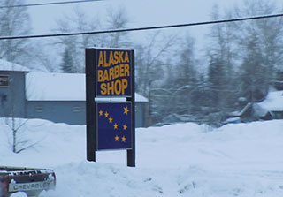 店の看板にアラスカ州の旗の絵柄が出ていました。北斗七星と北極星の図柄です。 これらはこちらでは天高く上がるので、アラスカらしいですね。 バスの車窓より。