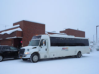 レストランに横付けの、ずっとお世話になっているバス。こんなに長いんです。 雪道も何のその、この大きさでもドライの道路のごとく、滑ること無くかっ飛ばします。 一人当たり2席のゆったり乗車がありがたいです。