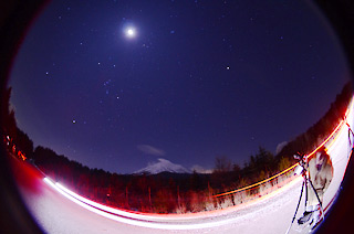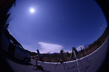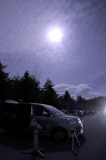 この日はとても条件の良い皆既月食が見られることになっていたので、事前にどこでどのように撮影するかをいろいろと策を練っていました。 ちょうど真夜中に皆既、しかも冬場は月の高度が高く、地上の景色と絡めた星景写真はかなり厳しいものがありました。皆既中の星空も撮りたいので暗いところが必須。その条件で地上もそれなりに絵になるもの、、、ということで、富士山を前景に入れることにしました。冬場にたまに利用している、鳴沢村の育樹祭記念広場の駐車場に決定しました。 遠征当日にスタッドレスタイヤに履き替え準備万端。日が沈む頃に出発しました。 ![]() 東名高速では、背後に満月が昇ってきているんだろうなと思いながら西に走り、足柄SAに立ち寄ってみました。丁度木立から満月が昇ってきたところでした。 記録画像として数枚撮影してから、食事を摂りました。 食事後、外に出ると雲が広がってきていました。まだ月食までは時間があるとはいえ、いやな感じです。 御殿場ICを下りて、あることをするためにちょっと寄り道をした後、目的地へ向かいます。もう、すっかり暗くなり、富士山がぼんやり見える距離まで来たとき、傘雲の崩れたような形の雲が掛かっているのが見えました。 上空の薄雲といい、傘雲といい、なんだかいやな予感がします。 ![]() 案の定、現地到着するも、傘雲の端に位置しているような感じで南側に雲多し。 しかも、南西の風が吹いてきてあっという間にほぼ全天で雲が流れている状況になってしまいました。 機材をセッテクングすべきか、、、、気象衛星の画像を確認すると、移動しても駄目なときは駄目、と思える雲行きだったので、腹をくくって、望遠鏡の設置です。 ←の画像は望遠鏡(今回の主砲はペンタ125SDP)そのものを赤道儀に載せるかどうか迷っていたときのものです。 ![]() その後、月食が始まる前には雲は去ってくれました(一番上の写真)。やれやれ。 そして、多く機材の準備をしながら、望遠鏡のピント合わせを終えたとき既に半影月食は始まっているところで、慌てて撮影開始です。 望遠鏡の方は基本的に自動撮影です。恒星時運転しているので月の動き分の補正を時々、食分が深くなった時はその状況に応じて露出を変える必要はありましたが、2分ごとにタイマーで淡々とブラケット撮影させていました。 画像はかけ始めの頃の様子です。 ![]() そして、皆既を迎え、最大食分の23:32の赤銅色の月です。 この色に魅了されます。 今回の皆既中の月は割と明るい分類に相当していたと思います。 光を失った月のお陰で、天の川も見える満天の冬の星空になりました。実に不思議な光景です。いつもの冬の星空との違いは、赤黒い丸い物体がぽかんと浮かんでいることでした。 ![]() 今回の撮影地の駐車場は行き止まりとなる道路の脇なのですが、割とマイナーな場所で静かに撮影出来るかと思いきや、ひっきりなしに車がやってきました。もちろん、ほとんどが月食目的なのですが、皆既中が一番車の往来が激しかったです。 これには閉口しました。望遠鏡での撮影は問題ないのですが、広角レンズを使った写真は成功率が非常に低かったです。 その後、皆既が終わり、後半の部分食の頃は、今度は帰りの車のラッシュ。一通りラッシュが終わるとやっと静寂がやってきました。でも、そこには天の川のある満天の星空ではなく、いつもの満月の夜の明るい空でした。 半影食も中盤になった頃、撮影を終え、撤収です。次なる目的地へ行くために。 ![]() 折角の満月です。どうせなら朝まで月をしゃぶり尽くそうと、富士山に満月が沈む「パール富士」を狙いに行きました。 実は月食の撮影地に直行せず、寄り道(前述の「あること」)をしたのは、パール富士の撮影地のロケハンをする為でした。 カシミール3DとGoogleのストリートビューを駆使して、目星を付けていた場所の下見をしていたのです。ほんの僅か数mの場所から富士山を眺めることが出来ることが分かりました。 途中の道の駅で50分ほど仮眠を取り、月が沈む1時間ほど前にパール富士のポジションへ到着。先客が1名いらしていました。 御殿場の夜景もきれいでした。富士山には雲が一切無く、うまくパール富士になりそうです。 ![]() 6:10、きっかり予定通りに月が富士山の山頂に触れました。 パール富士の通の方曰く、月の模様が出るのが良いのだそうです。でも、太陽と月の離隔、山頂の見上げる高度の関係で、今回は、いわゆる「だんご」の月になってしまうのは致し方ありませんでした。 私としては、これで満足です。 ![]() 片付けをしていたら、富士山が朝を迎えていました。 皆既月食、パール富士と実に充実した一夜でした。 今回の最低気温はマイナス5℃。夜中に突風が吹くことがありましたが、そのころは0℃位で体感的にはそのころが一番寒く感じました。 |
