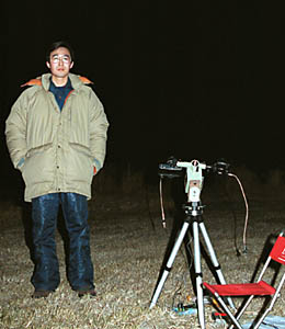 そして、こちらの写真が2000年を迎えてからの私と今回使った最小限の機材です。 2000年になった瞬間はオリオン座の方にあるベテルギウスをなぜかジッと凝視していました。また、遠くからは花火の音が響いてきました。 皆さんはどういうスタイルで2000年を迎えられましたか? |