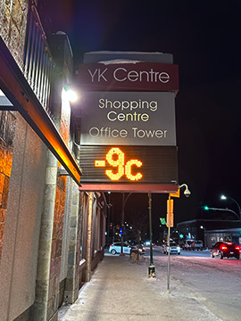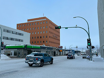 昼近くになり、ご飯を食べに外に出ました。イエローナイフの道路には基本的に信号機がありません。唯一、市街の中心を通るメインの道(Franklin Ave.)だけに存在します。例の気温の電光掲示板のある通りです。