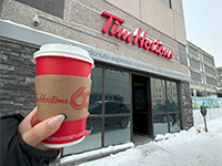そのあとはスーパーでお菓子などのお土産の追加調達をしました。こちらカナダでも買い物の時の袋は有料です。エコバッグを持って来ていて正解でした。続いてホテルのすぐ隣にあるコーヒーとドーナツで有名な「Tim Hortons」に来ました。今回の旅でも店の様子は何回か覗いていましたがようやく購入。 ドーナツも気になったのですが、昼食を摂った後だったこともあり、コーヒーだけ。