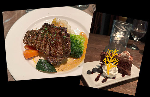 夕飯はツアーに組み込まれていたもので、またまたいつものホテルにまで出かけて行って、です。この日もオーロラを見に行く準備をして向かいます。背中に重い機材を担いでとぼとぼと歩きます。温度計のところまで来ました。気温は暖かめ。初日はそれなりに冷え込みましたが、二日目からは宵の口は大体こんな気温で拍子抜けです。 防寒着を着込んでいるので重い荷物を持っての歩きは暑くて仕方ありません。上着の前は閉めずに羽織っているだけにしました。 ![]() 今回はバイソンのステーキ。癖があるかと思いきや、普通にビーフみたいな感じで安心の美味しさでした。おしゃれなデザートのチョコレートケーキも頂きました。 ここからバスに乗ってオーロラビレッジに向かいます。 いよいよ最終夜、全勝なるか!? |