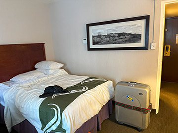 添乗員さんからの以下のことが告げられました。・早朝5:40発のイエローナイフ→バンクーバー便が欠航!帰国のための代替えルートを検討中。 ・昼12:55発でトロントまで行くことまでは確定。 ・その次は @トロント一泊で翌日にダイレクトに羽田に飛ぶ Aモントリオール行きに乗り換えて、そこで一泊。翌日に成田に飛ぶ の2つの候補があるが、未定。 なんとなんと飛行機が欠航とのこと。ここイエローナイフは曇ってはいるもののそんな天候ではない。では、バンクーバー側の天候なのか?エアカナダのサイトを確認するも、ただ欠航とあるだけで理由までは分かりませんでした。 ホテルまでのバスの運航をしてくれるオーロラビレッジのスタッフもその場に来ていてくれたので、バスに乗り遅れる心配はありませんが、とうに予定の発車時刻は過ぎていました。一通りの説明を受け、とにかくホテルに戻ることになりました。 ホテルに帰ってすぐにやらないといけないのは、防寒着の返却です。15分以内で借りた時のハンガーに掛けてロビーで待っていてくれるオーロラビレッジのスタッフに返却する必要がありました。長い間ありがとうございました。 確定しているトロント行きの便は昼過ぎなので、ホテル出発は11時前になり、ゆっくり休めることになりました。