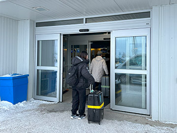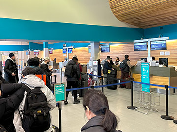バスでイエローナイフ空港に到着。小さい空港なので入り口も地味です。平屋なので入ったフロアそのままでチェックインカウンターになります。