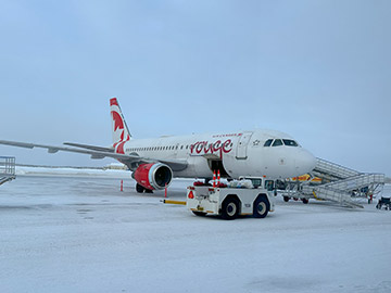 セキュリティを抜け、待合室から見る搭乗機。 エアカナダの子会社のエアカナダルージュでした。