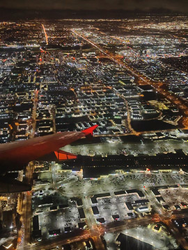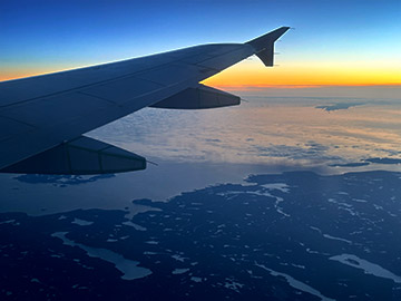 今回の旅で初の窓際席。東に向かって飛行しているので、主に南側の景色が見えます。次第に日が暮れてきて、美しいグラデーションの空になってきました。少し上を見ると月も見えていました。 ![]() トロントが近づき、高度を下げてくると街明かりがきれいに見えてきました。 19時半過ぎ、トロントのピアソン空港に到着。