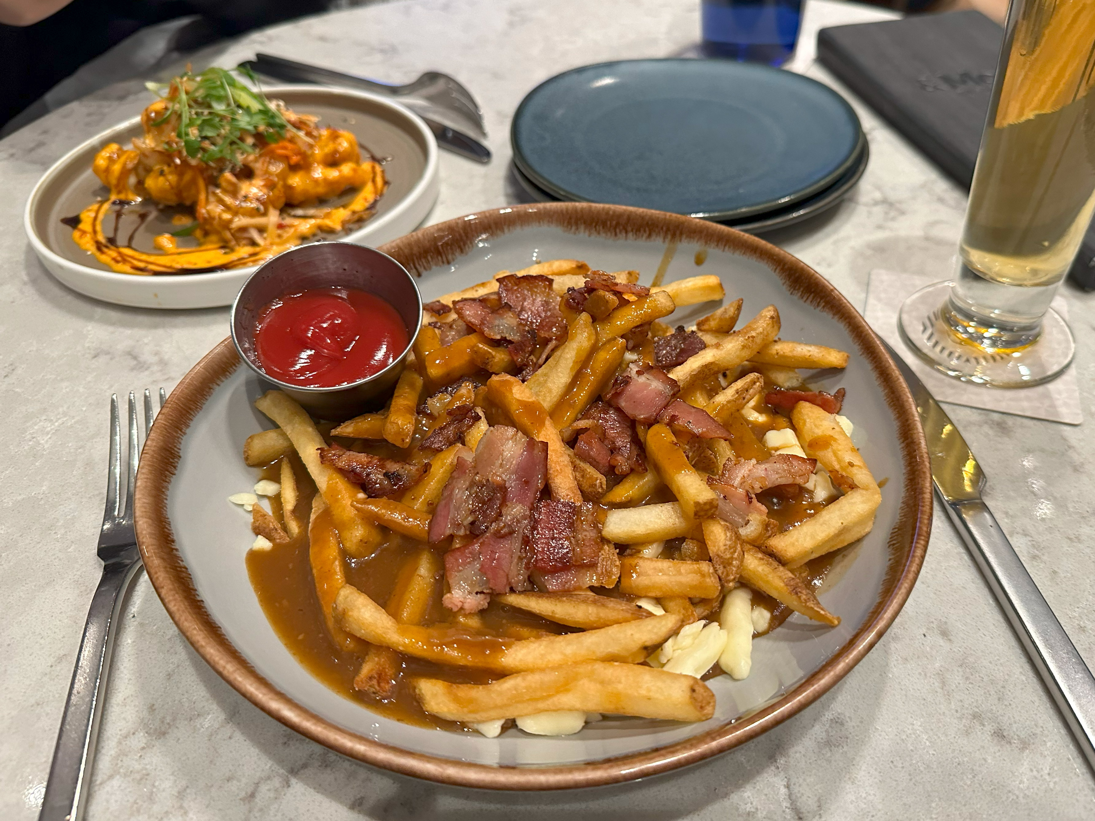 さて、何を食べようか。メニューを見ていて、「TASTE OF CANADA」の文字が目に入ったので、その「CLASSIC POUTINE」なるものをオーダーしてみました。いったい、どんな料理なんだろう?出てきたものはポテトフライにチーズが載っていて、さらにグレイビーソース(肉汁ソース)が掛かったものでした。オプションでベーコンも追加しました。 これが旨いのなんのって、ビールととても合いました。 娘が選んだのはエビに衣をつけてカラッと揚げたものに辛目のソースが掛かったものでした。メニューからは辛いことが読み取れず、辛いのが苦手な娘はちょっと可愛そう。まあ、シェアして食べたので何とかなりました。 私は辛いのは好きなのですが、それでも辛かったです(^^;