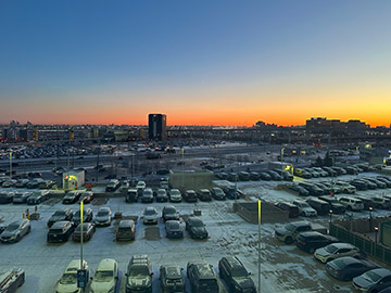 7時起床。ちょうど日の出前で、地平線が赤く染まっていました。昨夜は短時間でしたが雪が降り、積もっていました。 快晴のいい天気。さあ、今日でカナダとお別れ、帰国だ。