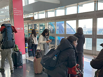 説明の途中の添乗員さんのところに娘がスタスタと向かってスマホの画面を見せて、『えー!』 「遅れている様ですが、取りあえずこのまま空港に移動します!」と添乗員さん。 Terminal-1に移動する列車のホームにて、真ん中に写っているのが添乗員さん。スマホで情報収集している様です。ほんと、今回の帰国に向けては災難続きで大変そうでした。でも、しっかりサポートして頂けて助かりました。これが個人旅行だったらどうなっていたことか。