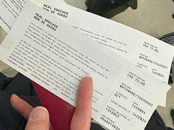 Terminal-1に到着し、早速チェックインです。チェックインは機械でやります。遅延しているので新たな搭乗券と、預け荷物に付けるタグ、それから、遅延に伴い30カナダドル分のミールバウチャーがプリントアウトされてきました。 食事にしか使えませんので、昼食用にしっかり活用させてもらいます。