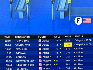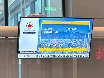 当然ですが、空港内の電光掲示板でもAC001便には「Delayed 18:00」の表示が。何で遅延しているのでしょうね。こんなに遅れているのはこの便だけ。祟られている。。。。 こんな遅延の仕方をしているので、この先、空港で時間つぶししている間も気を付けてチェックしておかないと危険ですね。