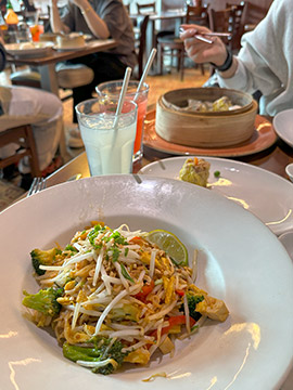 昼食をどこで食べようかと、空港内の食事処をスマホでチェック。良さげな店を見つけてそちらに向かいました、、、、が、どうも様子が変です。行きたかったのは国内線のエリアでした。気が付けば、セキュリティ外に出てしまっていて、元の国際線エリアに戻るのに改めてセキュリティチェックを受ける羽目に(^^; そして、国際線エリアで見つけた店はアジア系のレストラン。 私はパッタイ、娘は点心を選び、ドリンクをそれぞれつけて、合計$64.98。内、$60はバウチャーを使えたので実質$4.98で済みました。 パッタイは予想通りの味でしたが、点心の方はボリュームもありとても美味しかったです。