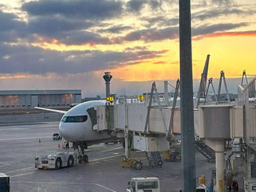 ようやく搭乗です。もう、日が暮れそうです。この飛行機で羽田まで帰ります。これだけ遅れると、羽田から自宅に戻る手段が怪しくなってきました。オンタイムだったら、帰宅ラッシュのころになりそうだったので、リムジンバスを使うつもりだったのですが、もう、それは終わってしまう時間なのは確実です。 遅い時間になるので、電車も空いているはずなので京急を使うことにしよう。