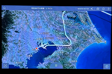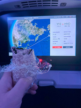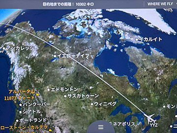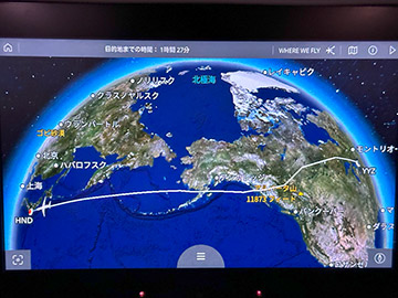 トロントを離陸してすぐのころのフライトマップ。目的地への最短のラインが描かれているということもありますが、なんとイエローナイフをかすめるコースになるんですね。苦笑いです。 羽田まで約14時間のフライトです。そのうちの4時間位は本来不要な時間、、、、 一度しか行ったことのないヨーロッパに行くみたいな長時間ですね。
