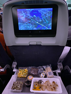 日本が近づいてきました。時刻は日付変更線を通過したので、+1日して日本時間では2/15の20:30、北海道沖を飛行中です。日本でいうところの夕飯に相当する食事のサービスが始まるようで、レンジで温めた香りが漂ってきました。どんなものがでてくるかな、、、、。 と、気流の悪い場所に通りかかり、機体が揺れ始め、シートベルト着用サインが。 なかなか、揺れは収まらず、時が過ぎていきます。ということは着陸の時が近づいてきます。そして、なんと「食事のサービスは中止します!」と機長アナウンスが。 がーん、美味しいかどうかは分かりませんが、最後の楽しみにしていた食事がぁぁぁ。 全部廃棄になったのでしょうね、勿体ない。