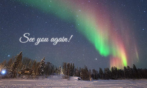 そして定刻から5時間遅延の22時に無事、羽田に到着しました。預けた荷物が出てくるターンテーブルのところで、ツアーの同行者たちと再会。お疲れさまでした、などと挨拶をしていましたが、なかなか荷物が出てきません。 着陸した時点では電車はまだ余裕だな、と思っていたのですが、次第に焦りの色が、、、終電の時間が近づいてくる。 かなり待ってようやく出てきました。我が家分の荷物は同行者の中では早く出てきた方でした。荷物を取り上げて「皆さん、さようなら。お世話になりました!」急いで駅に向かいます。 なんとか終電に乗り継げる電車に乗ることができ、自宅に辿りついたのは日付が変わって夜中の1時過ぎになってしまいました。 こうして、今回のイエローナイフ、オーロラの旅は幕を下ろしました。 4回のオーロラ鑑賞チャンスがあり、3回も晴天に恵まれ、3夜目にはブレイクアップもある見事な姿を見ることができました。 そして何より、娘と一緒にオーロラを見ることができたのは、一生の宝物です。 帰国に際しては、欠航という初めての経験をし、思いがけずトロントまで行くというハプニングもありましたが、これはこれで良い思い出になりました。 さて、前回の5年前のオーロラの遠征記の最後は「See you again」で締めていました。そして、それが本当に今回実現することができました。 ということで、今回もまた次を期待して同じように締めたいと思います。 ![]() |