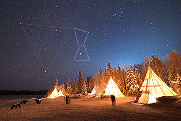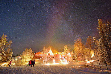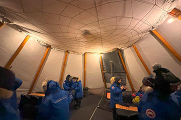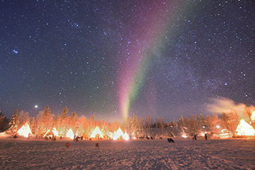 雲一つなく満天の星、南中しているオリオン座が日本で見るよりも遥かに低空に見えていることに感動。高緯度の地に来たことを星空で実感できました。まずは、施設内の案内です。敷地はかなり広く、ティーピーのある湖畔だけでなく、小高い丘もいくつかありそれらを歩いて回って紹介して頂きました。幸い、まだオーロラの姿はなく、安心して回ることができました。
