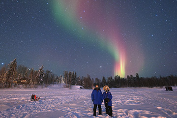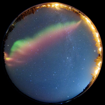 魚眼レンズで空全体を切り取りました。 東の地平線から立ち上っているオーロラは北西へとつながり、天を横切る帯となっています。天の川もクロスするように見えています。この時のオーロラは肉眼ではほとんど色は分からない程でしたが、写真に撮ると実にカラフルで見ごたえがあります。 まるで夜空にかかった虹のようです。