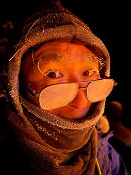 オーロラ鑑賞の時間は決まっていて基本的には01時にホテルへ戻るバスが出発します。そのため、0:50には各ティーピー前に集合することになります。カメラを2台も出しているので、撤収の時間も含めて気にしながらの撮影になります。オーロラが出ていても撤収しないといけないは実に残念です。これがプライベートツアーとは異なるデメリットですね。 もっとも、そのころにはオーロラが淡めになってきていたので、安心して撤収することができました。が、ティーピー前に集合したところで突然オーロラに動きが!なんてこった、まさに頭上での乱舞が始まりました。ブレイクアップほどではないものの、この夜一番の見どころになりました。皆さん、名残惜しそうにしながらバスに向かいました。 ところで、初日はマイナス26℃まで下がりましたが、防寒着セットに付いていたフェイスマスク(これは貰えます)の防寒性が良いからか、気を付けていても息が眼鏡の方に回ってしまって、途中からは霜で見えなくなってしまいました。帰りのバスに乗り込む直前にはこんなになってました(^^; まつ毛にも霜が、、、、 ちなみに、全く寒さを感じることはありませんでした。 こうして、第一夜から満天の星の下、きれいなオーロラにであることができ、幸先の良いスタートを切れました。初めてオーロラを見た娘よ、初日からこんなに見れるなんて実にラッキーなことなんだぞ! |