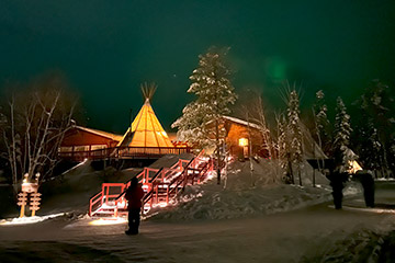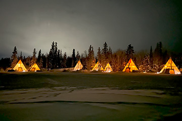 21時半頃にオーロラビレッジ到着。見上げる空には星はなく曇り空です。昼間はきれいな青空が広がってくれていたのに、、、、、しばらくはティーピーの中で過ごしていました。 ところで、前夜は眼鏡が曇って見えなくなってしまう失態を冒したので、フェイスマスクは使わず、自前のネックゲーターと毛糸の帽子を使って吐く息が眼鏡に回らないようにしてみました。