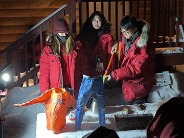 オーロラビレッジでは、毎晩23時にアイスショーをやっています。相変わらず曇っていたので、手ぶらで見に行くことにしました。開催場所は聞いてはいたものの、すぐに分からず、ようやく見つけた時には既に始まっていました。濡らした服などが立体的になって凍って固まっていたり、バナナで釘打ちも目の前でやってくれました。この日はそんなに冷えていなかったので、ちょっと怪しかったですが(^^; 15分程度だったでしょうか、このショーはお開きに。
