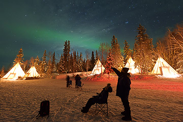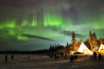 ティーピー越しにカーテン状の縦筋のあるオーロラが棚引き始めました。オーロラビレッジに来たら押さえておきたい光景です。縦筋がサラサラと動き回る姿は感動的です。