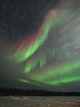 左に目をやるとこんなオーロラが。贅沢を言えば、雲のないクリアな空で見たかったところです。時刻は0:33。こんな良い感じのオーロラが出ているというのに、そろそろ撤収を始めないといけません。帰りのバスに乗るために、皆さんティーピー前に集合していると、前夜と同じようにますますオーロラは激しく、、、、またか(> <) あー、延長できなかったことが悔やまれます。 ところで、眼鏡の曇り対策は上に書きましたが、気温がマイナス13℃と前夜ほどでなかったこともあるのかも知れませんが、全く曇ることもなく快適でした。首から頭の防寒はこの作戦で決定。 |