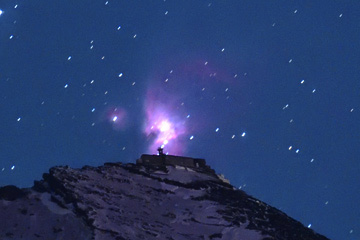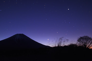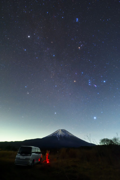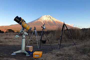 あけましておめでとうございます。平成最後の正月を迎えました。 正月と言えば「しぶんぎ座流星群」。今年は丁度月も細く絶好の流星撮影タイミングです。 長野方面より富士山周辺の方が確実に晴れそうだったので、今回はとにかく雲の影響を受けないことと、やっぱり、正月と言うことで富士山を眺めながらの星空を楽しみたく定番の朝霧高原に行くことにしました。 余裕を持って日が沈む前に現地着。機材のセッティングをほぼ終えた16:20頃、すぐ西にある山に日が沈んでいきました。 雲一つ無い空が次第に暗くなっていきます。夕暮れ時から忙しくなりそうだったので、暗くなる前に腹ごしらえしました。 ![]() 次第に暗くなる空に天の川も見えてきました。 と、そのさらに南側の空に明らかな光芒が。この方向には光害となるものは無いはず。 おっと、そう言えばさっき太陽が沈んだ方角から立ち上っているぞ。もしかして、、、、、 カメラでも撮影してみました。もしやこれは、、、、黄道光!? スマホアプリで黄道を表示してみるとピッタリ一致しました。朝霧高原で夕方の黄道光を見た記憶は無かったような。 新年早々、いいものを見ることが出来ました。 ![]() 今回の遠征の主目的は「しぶんぎ座流星群」なのですが、もう一つ、富士山の山頂から昇るオリオン大星雲がありました。 この撮影地は何度も使っているのですが、丁度、富士山山頂のかつての測候所から昇ります。 今回は昇ってくる瞬間も狙おうとしっかりと準備をすることにしました。 予定時刻の数分前から、2台の焦点距離の異なるカメラで連写しながら待ち受けました。 この写真は500mm超の焦点距離で狙い、地上はブラせたくないのでISO8000,2秒露出での固定撮影としました。そしてさらにトリミングしています。 ![]() 最初のターゲットを無事撮影し終えて一段落。 流星群は輻射点がそこそこ昇る夜半過ぎからなので、それまでは普通に望遠鏡での撮影や、星景写真などの撮影をして過ごしました。 周りに誰もいない富士山を望む撮影ポイントで静かに過ごす至福の時間。 冬のダイヤモンドが丁度富士山の上にバランス良く昇ってきていました。 ![]() 昨年末に地球に接近し、肉眼でも見えるようになったウィルタネン彗星(46P)。 見頃の時に取り損ね、ようやく望遠鏡で撮るチャンスが巡ってきました。 ふたご座流星群を見に行ったとき以来の再会です。大分、暗くなってきていました。 それでも、撮影してみると大きく広がった緑色の立派なコマが見えてきました。 ![]() 時間がたっぷりあるので、じっくりとプレアデス星団を撮ってみました。 オリオン大星雲と同様、メインの青い星雲は簡単に写りますが、周辺まで表現するとなるとそれなりに苦労もあり撮影から処理までのプロセスが面白いです。 ![]() 星景写真を撮るには富士山以外に何も無い殺風景な場所。 北は甲府、北東は東京方面、南は富士宮の明かりが立ち上っているのが良く分かります。唯一暗いのが南アルプスがある西の空です。 天の川が天を二分する23時頃の星空です。 気温はマイナス一桁の前半そこそこなのですが、北風がやや強めに吹いていて寒い! ![]() そろそろ「しぶんぎ座流星群」の輻射点が昇ってくる時間になってきたので、流星撮影モードに変更。 2台のカメラで連写開始。時折、流れはするものの、これと言って沢山流れる感じではありません。極大が4日の昼間なので仕方ありません。 良い感じのが流れたな、と思ったら、数コマ前でバッテリーが空になっていて残念! などと言うこともありながら、一片の雲も流れて来ない完璧な空の下、撮影は続きます。 そんな中、北斗七星の近くにしっかりとした流星が流れてくれました。しぶんぎ群です。 ![]() 夜明けが近づくと富士山のシルエットがくっきりとしてきて金星、木星、そして細い月も昇ってきました。 さそり座も上半身が昇ってきていました。 ![]() 機材の撤収が終わると富士山の右裾から太陽が昇ってきました。 これが自分にとっての2019年の初日の出となりました。 こんな景色を眺めながらの朝食を済ませました。 ![]() 帰り道、この時期にちょっとした楽しみにしている公園に立ち寄りました。 毎年、形の違う氷のオブジェのある西湖の野鳥の森公園。 平成最後の正月ということでしょうか、「平成」の文字がありました。足元は氷でツルツル。気をつけないと滑りそうです。 ![]() 青空の青、と氷のオブジェの白とのコントラストが目に眩しいです。 その後は、、、、、 ![]() 2日に妻の実家に新年の挨拶に行ったときに、そのまま自主練のために置いてきた娘をピックアップしに行き、それから帰路に就きました。 今回の遠征は空の暗さよりも、確実な晴天を第一優先としましたが、狙い通り、一切雲に邪魔されることがありませんでした。 最低気温はマイナス6℃。カラッカラに乾燥していて車にも全く霜が付きませんでした。 お陰で流星写真のためにカメラを長時間空を見上げさせていましたが