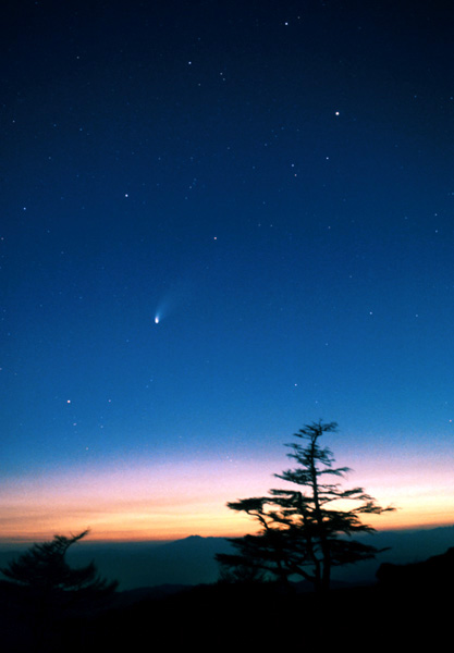 夕焼け空に輝く、去りゆくヘール・ボップ彗星 1997年5月1日 19時36分から30秒露出 Aiニッコール35mm(F2) 絞りF2.8 ニコンNewFM2 フジクローム プロビア400 撮影地/長野県入笠山