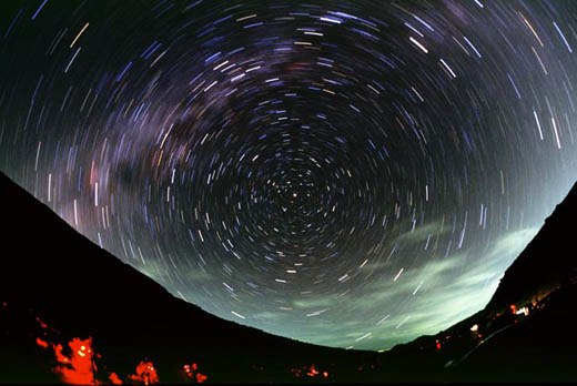 時の流れ(北天の日周運動) 1998年9月20日 01時04分から25分露出 Aiニッコール16mm(F2.8) 絞りF4 ニコンNEWFM2 エクタクロームE100S(4倍増感) 撮影地/乗鞍鶴ヶ池駐車場